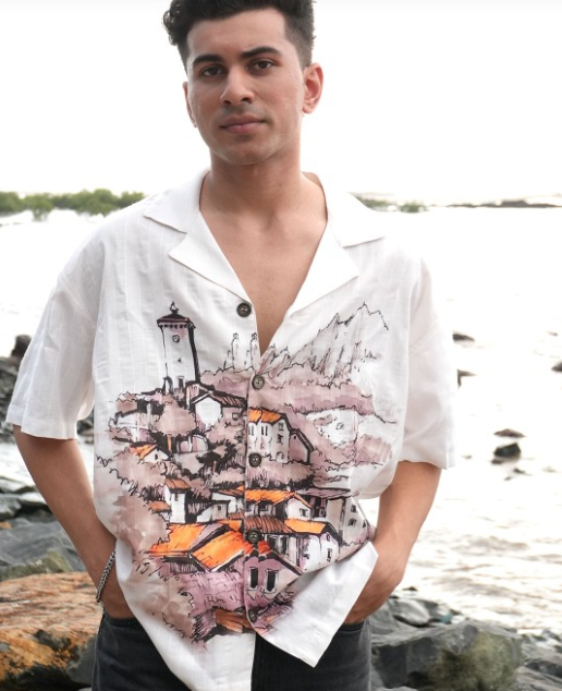 Professionally designed men’s opaque casual shirt featuring distinctive graphic prints on white fabric. Constructed with a classic collar, functional button placket, convenient pocket, and stylish short drop-shoulder sleeves for a contemporary silhouette.