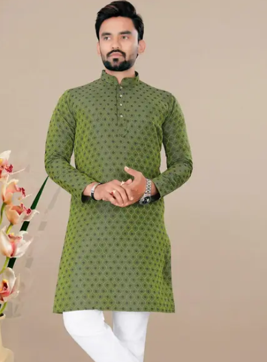 Look your ethnic best wearing this kurta for men. Made from Cotton blend with Jacquard. This regular-fit kurta is a full-sleeved kurta and complete your look. Team this outfit with embroidered mojdi and rock the party that you attend. Kurta Payjama Set.