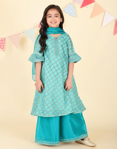 Elevate your ethnic wardrobe with this Teal Cotton Silk Hand Block Printed 3-piece Salwar Set. Crafted from a luxurious cotton silk blend, it offer
